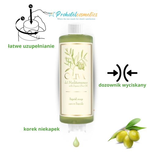 Kosmetyk hotelowy OLIVA został wyprodukowany we Włoszech i doskonale sprawdzi się w hotelach, SPA oraz apartamentach, podnosząc standard wyposażenia łazienek dla gości. Mydło w dozowniku wyciskanym , z możliwością łatwego uzupełniania, pozwala znacząco obniżyć koszty, ograniczyć ilość odpadów i wspierać ekologiczne rozwiązania w branży hotelarskiej.