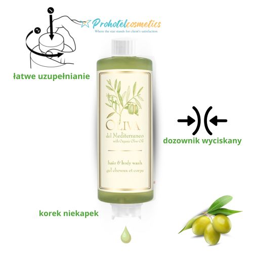 Kosmetyk hotelowy OLIVA 2w1 został wyprodukowany we Włoszech i doskonale sprawdzi się w obiektach takich jak hotele, SPA czy apartamenty. Dozownik wyciskany, z możliwością łatwego uzupełniania, pozwala znacząco obniżyć koszty, ograniczyć ilość odpadów i wspierać ekologiczne rozwiązania w branży hotelarskiej.