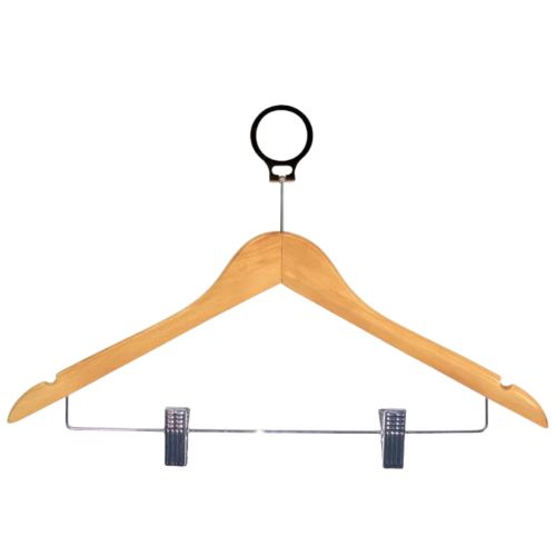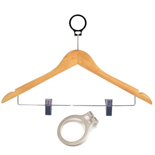 Komplet składający się z wieszaka z klipsami i metalowego pierścienia, który zabezpiecza drewniany wieszak hotelowy przed kradzieżą. Wieszak został wykonany z najwyższej jakości drewna z lekkim połyskiem zabezpieczającym powłokę przed zużyciem.