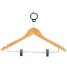 Hotelowy wieszak drewniany antykradzieżowy, kształt standardowy, nacięcia na ramionach. Komplet składający się z wieszaka i okrągłego uchwytu, który zabezpiecza drewniany wieszak hotelowy przed kradzieżą. Wieszak został wykonany z najwyższej jakości drewna z lekkim połyskiem zabezpieczającym. Dodatkowo, produkt posiada specjalną antypoślizgową powłokę na uchwycie na spodnie, która uniemożliwia ślizganiu się powieszonego materiału.