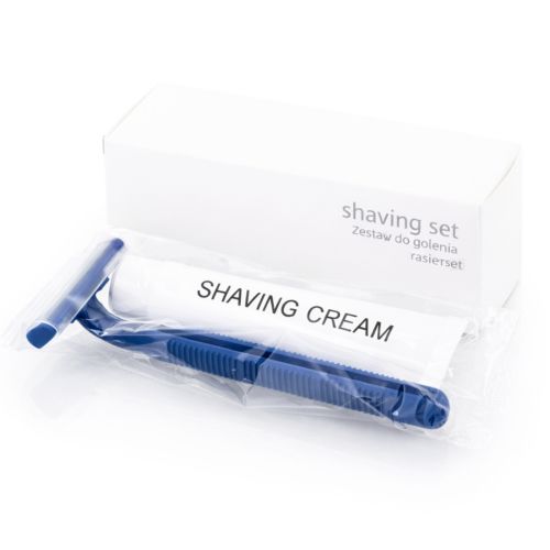 Hotelowy zestaw do golenia w białym, papierowym kartoniku. Zestaw zapakowany dodatkowo w folię. Opakowanie nadaje się w 100% do recyklingu. Zestaw składa się z maszynki i kremu do golenia w tubce 15ml.