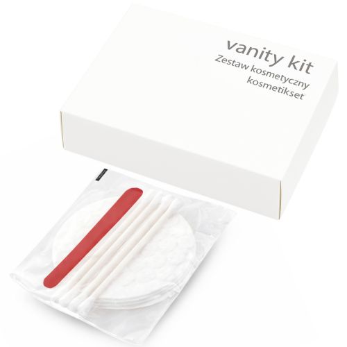 Zestaw kosmetyczny w kartoniku. Zestaw składa się z 3 płatków, 4 patyczków i pilniczka do paznokci. Całość pakowana w biały, papierowy kartonik. Opakowanie nadaje się w 100% do recyklingu. Opakowanie zbiorcze (karton) 250 sztuk.
